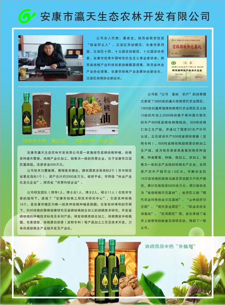 安物以稀為貴,油以硒為本,健康產業在路上安康市瀛天生態農林開發有限公司隆重推出:100%純核桃油,通過冷榨而成的木本油料,無任何添加劑, 核桃油中含有92.2%植物性的Ω-3、Ω-6不飽和脂肪酸。